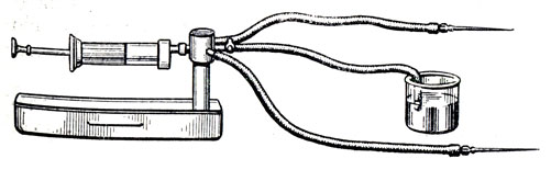 При переливании консервированной крови на конец ампулы насаживают резиновую трубку с иглой, которую затем вводят в локтевую вену больного (рис. 15). На резиновую трубку надевают зажим; с его помощью можно регулировать скорость введения крови - быстрым ("струйным") или медленным ("капельным") способом.