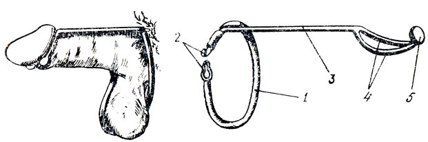 Первый эректор был разработан С. А. Плотигером и усовершенствован И. М. Порудоминским [53]. Основу протеза Плотигера представляет кольцо, через которое проводят половой член и мошонку. На одном участке оно имеет шарнир, к которому крепится тонкий стержень. Конец стержня заканчивается двумя дугами, обладающими необходимой упругостью и способными после раскрытия смыкаться. Кольцо, через которое проведен половой член с мошонкой, располагается таким образом, чтобы стержень прилегал сверху к телу полового члена и лежал вдоль него на коже, а дуги находились в венечной борозде, охватывая с двух сторон головку (рис. 12). В результате заключенный в протез половой член приобретает положение, характерное для состояния эрекции, что позволяет осуществить половой акт.